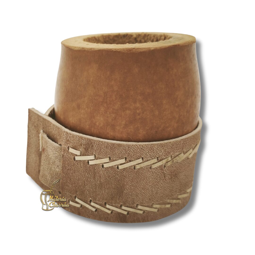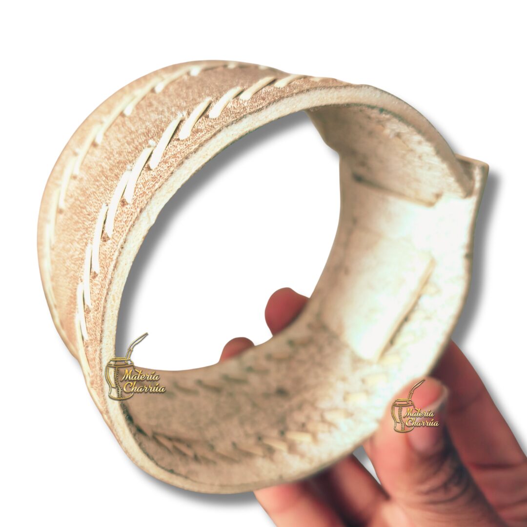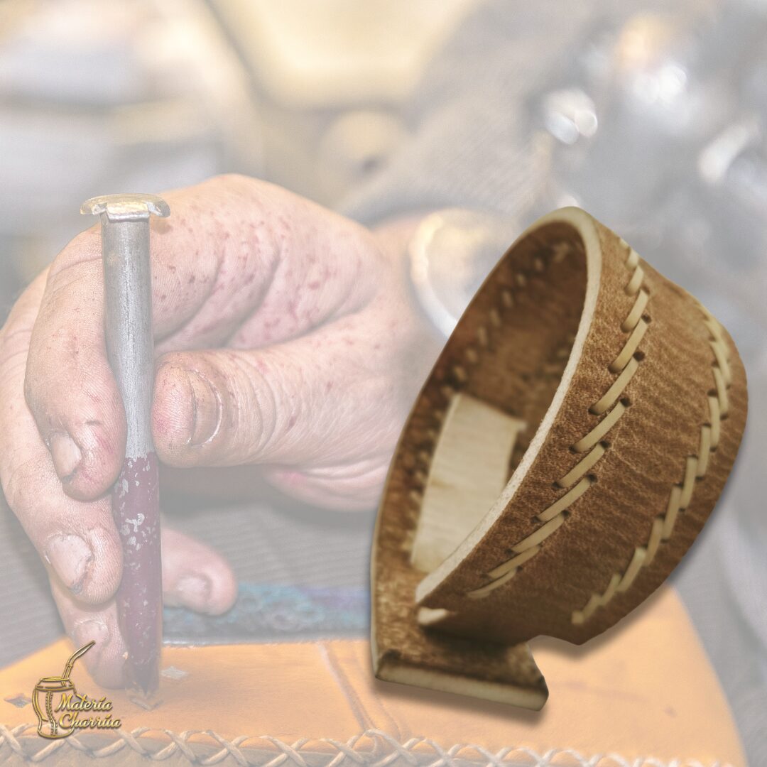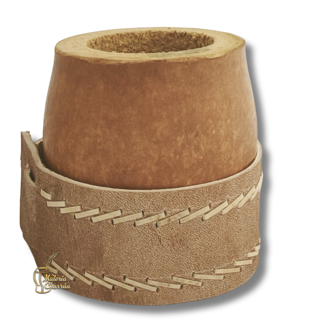 Gruesa de Excelente Calidad! pulida y trabajada, un posamate hecho de cuero curudo vacuno, tratado de manera artesanal, le da un porte Gaucho, sencillo y tradicional, este tiene una decoración de costuras cosidas con tientos que le da porte elegante y firmeza, (tiras de cuero cisidas a mano).