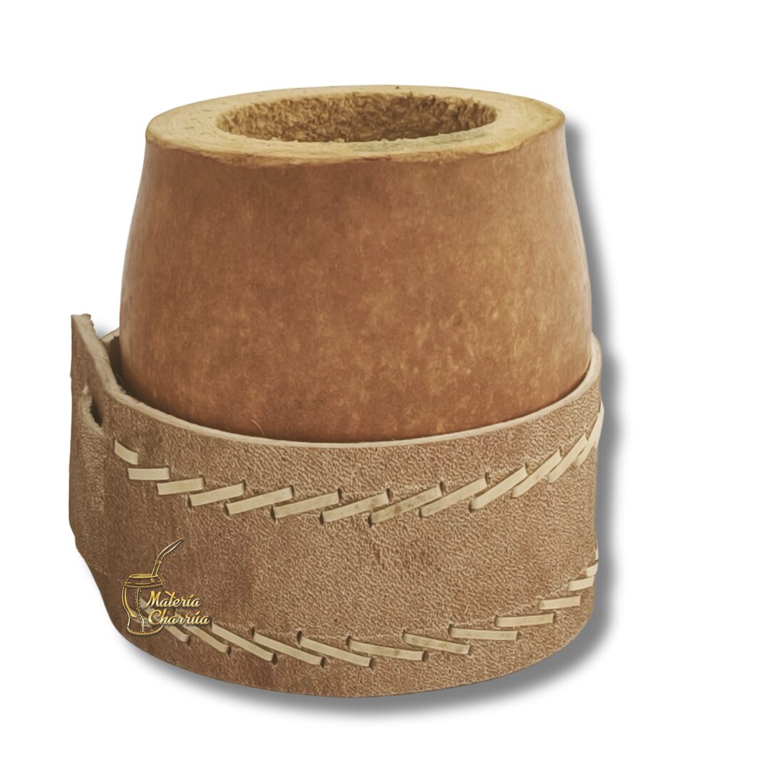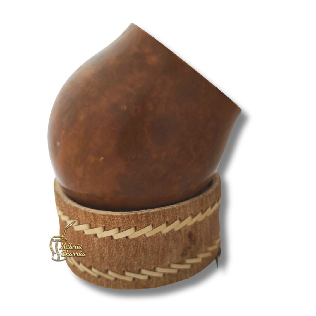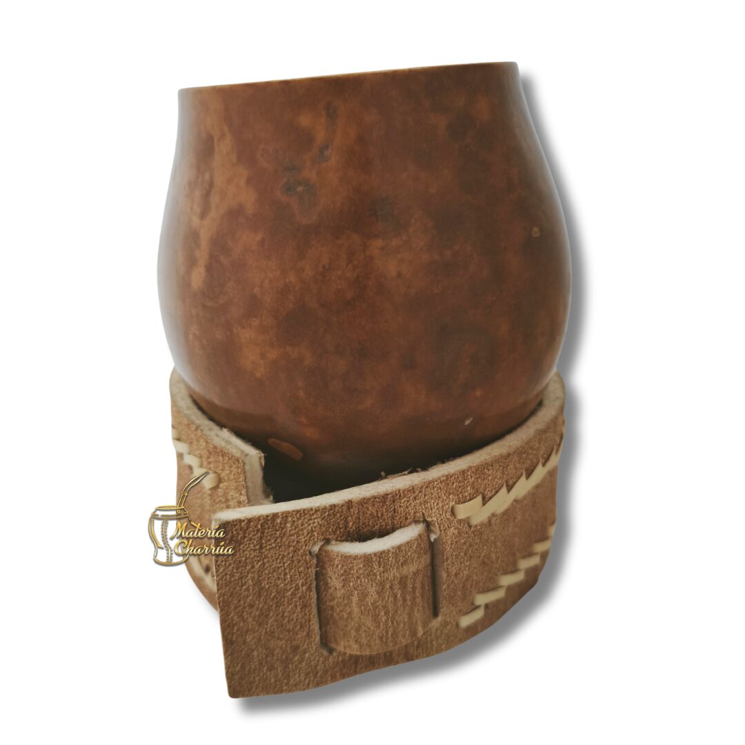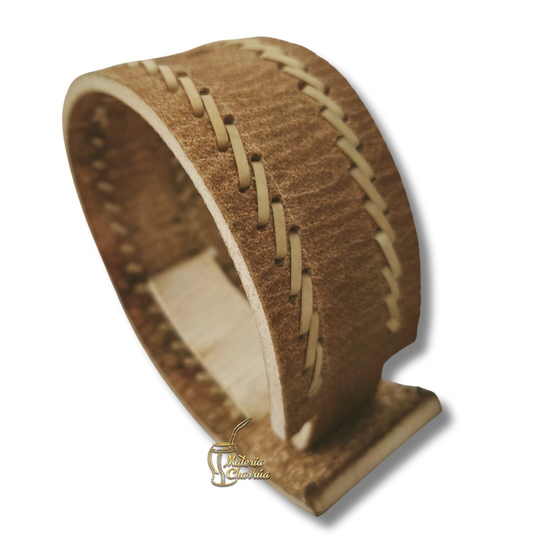 Gruesa de Excelente Calidad! pulida y trabajada, un posamate hecho de cuero curudo vacuno, tratado de manera artesanal, le da un porte Gaucho, sencillo y tradicional, este tiene una decoración de costuras cosidas con tientos que le da porte elegante y firmeza, (tiras de cuero cisidas a mano).