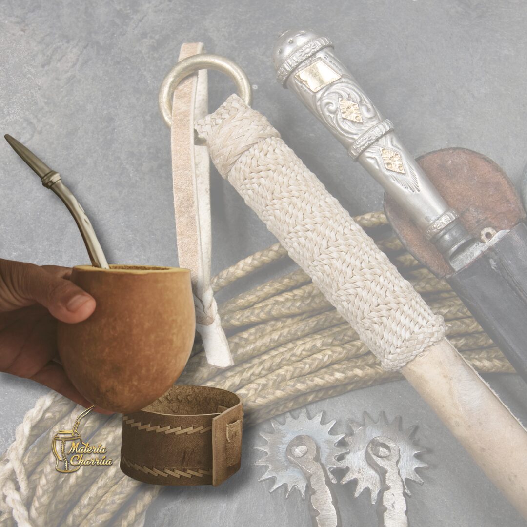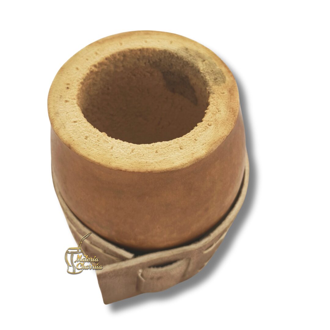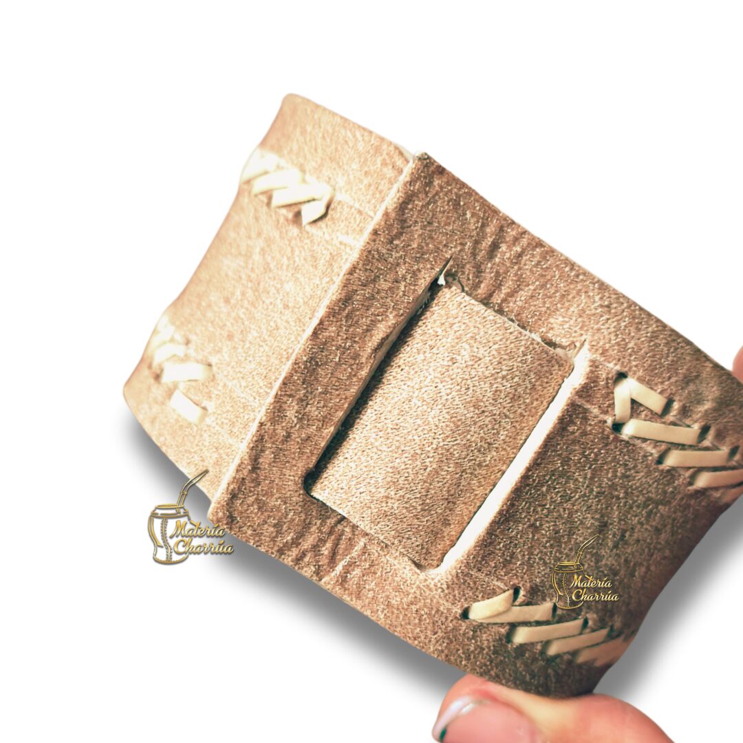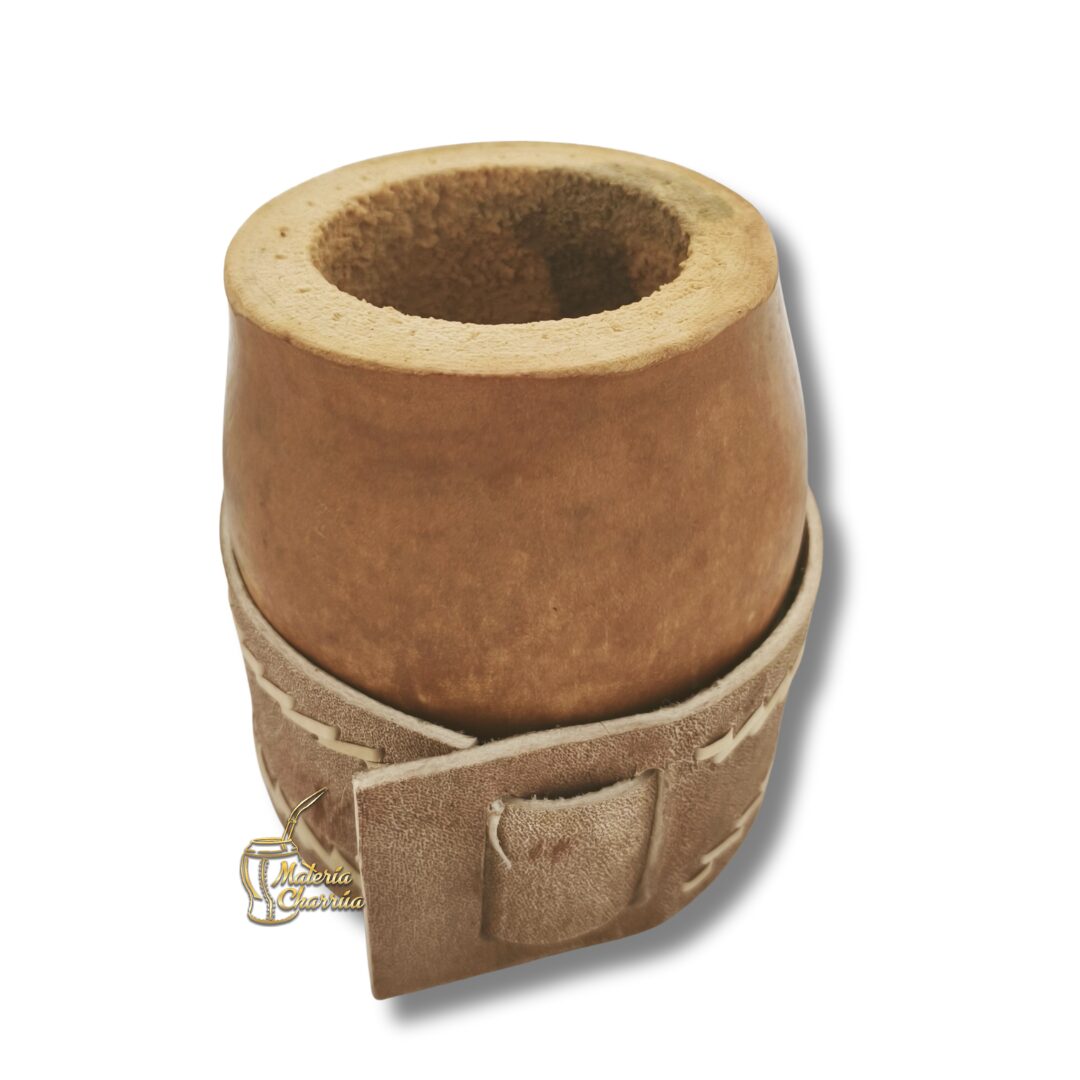 Gruesa de Excelente Calidad! pulida y trabajada, un posamate hecho de cuero curudo vacuno, tratado de manera artesanal, le da un porte Gaucho, sencillo y tradicional, este tiene una decoración de costuras cosidas con tientos que le da porte elegante y firmeza, (tiras de cuero cisidas a mano).