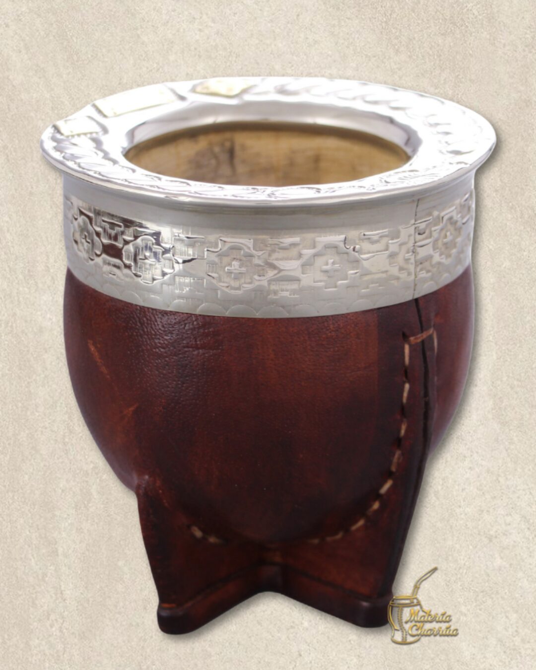 Calabaza con un grosor superior a 12mm, forrada de manera artesanal, cómo lo hacían desde hace más de 50 años, la tradición se ah pasado de generación en generación  por los artesanos del Uruguay, utilizando cueros de excelente calidad, hilos gruesos, alpaca de alta calidad, solidez  y belleza de los cincelados, manualmente,  todo para poder garantizarte un mate espectacular por mucho, mucho tiempo.