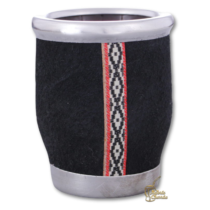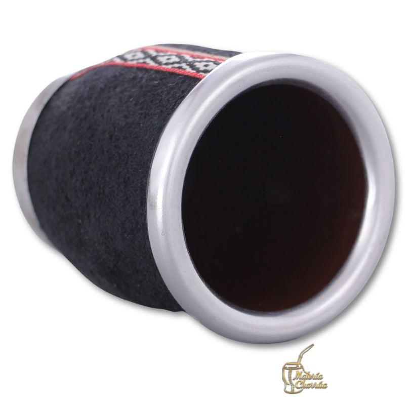 Mate de vidrio templado, forrado de manera artesanal con cuero original de pecarí, virola y base de aluminio, con una fajilla vertical decorativa de guarda pampa, excelente opción para quienes se inician en el mundo del mate.